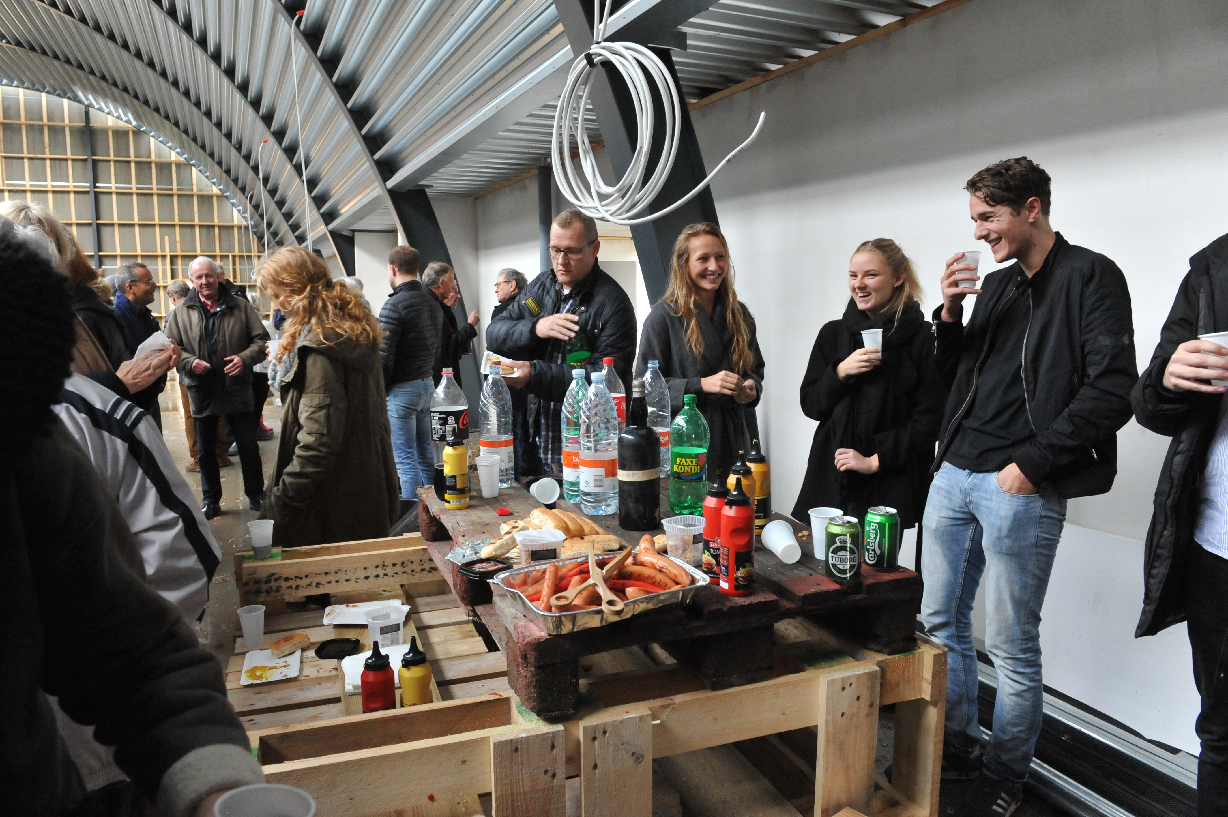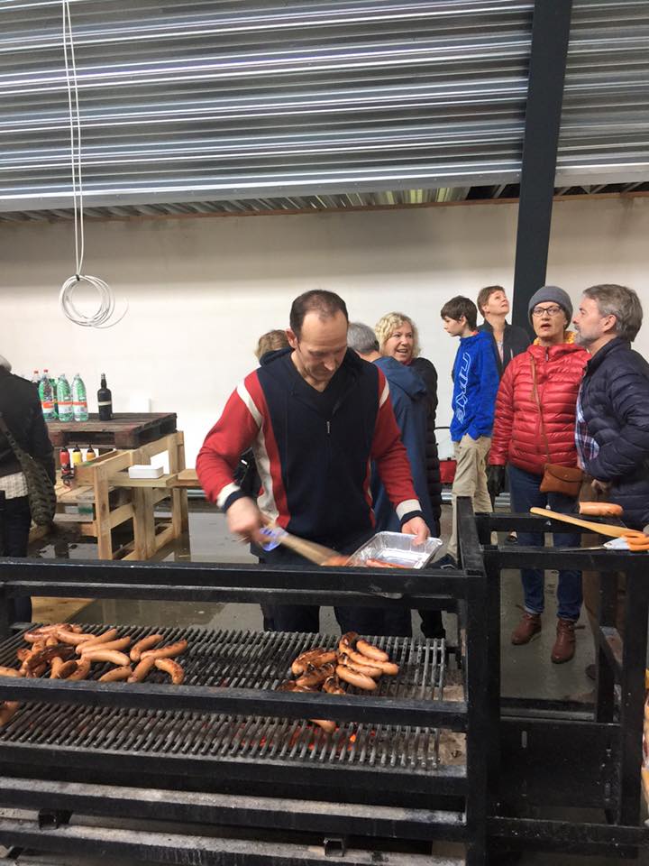 Alle fremmødte fik mulighed for at se den nye badmintonhal tage form, stille relevante spørgsmål til byggeriet, og samtidig kunne de nyde lidt forfriskninger i form af øl, vand og en masse pølser & brød.